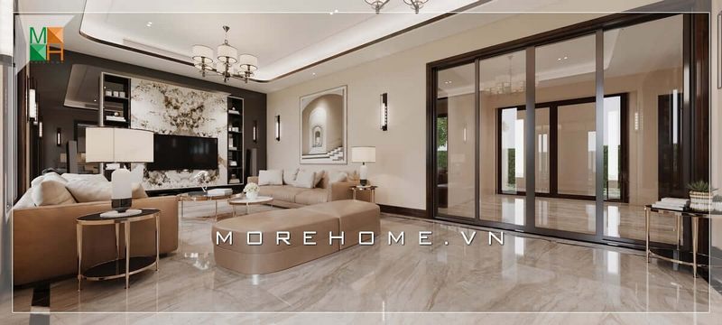 Không gian phòng khách biệt thự được thiết kế hướng đến sự nhẹ nhàng với nội thất hiện đại và các trang trí đơn giản tạo cảm giác thoải mái và sang trọng trong không gian sinh hoạt chung của gia đình