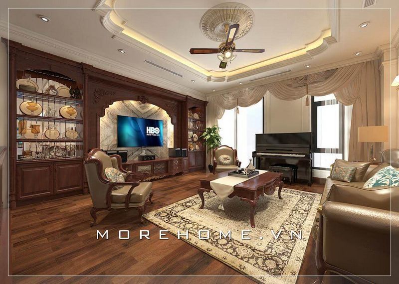 Thiết kế không gian phòng khách với nội thất gỗ tự nhiên tân cổ điển sang trọng và đẳng cấp