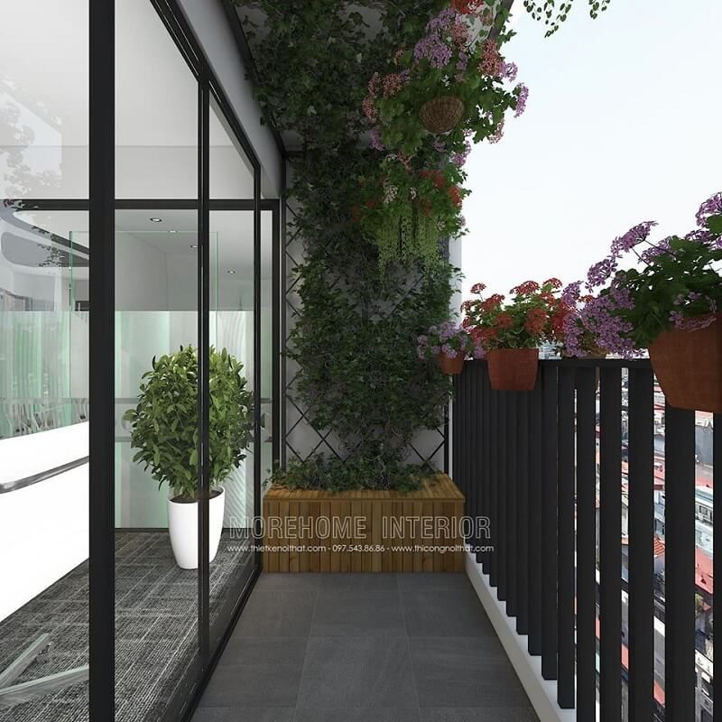 Thiết kế ban công văn phòng đẹp với lan can được trang trí cuốn hút với những chậu cây hoa cảnh mang đến không gian thư giãn lí tưởng