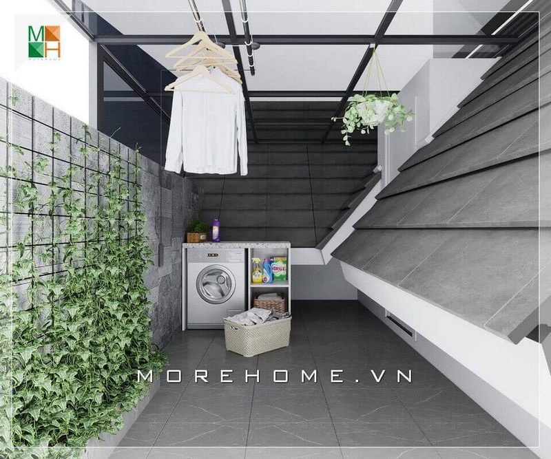 Ấn tượng với mẫu thiết kế nội thất không gian ban công giặt và phơi đồ rất hiện đại, cảm giác gần gũi với thiên nhiên với giàn cây leo tường rất đẹp phù hợp cho không gian nhà phố, biệt thự và chung cư cao cấp.