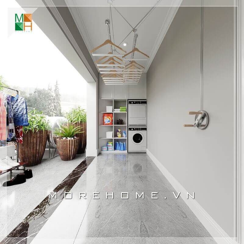 Mẫu thiết kế ban công rộng cho biệt thự nhiều người mong ước. Trần nhà thiết kế thêm dàn phơi đồ thông minh.