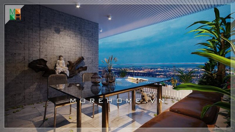 Ấn tượng mẫu bàn ghế mặt kính ban công sang trọng phù hợp với không gian thiết kế nơi đây.
