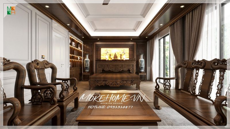 Bộ bàn ghế màu nâu trầm được cắt tỉa tỉ mỉ với các đường cong quyến rũ sẽ góp phần tạo nên sự sang trọng và quyền lực thẩm mỹ cao cho phòng thờ của bạn.